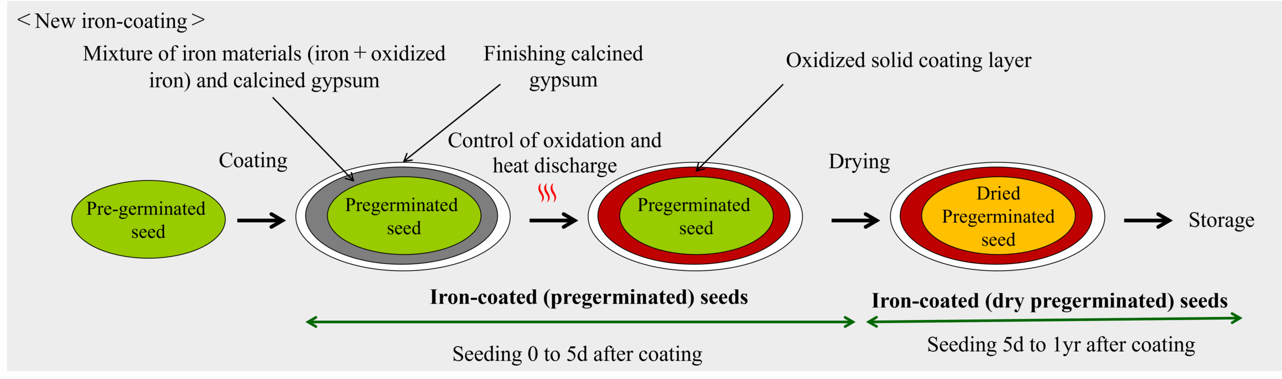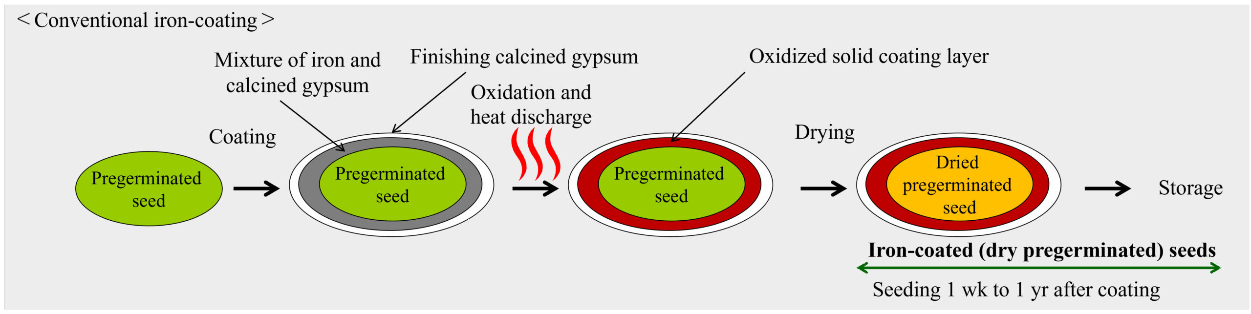 - On the other hand, there were disadvantages, such as the fact that the heat generated by iron oxidation may happen to damage the seed viability, the coated seeds tending to stick together, forming clumps, and the need for long preparation time (mostly a week or more), all of which make the coating process troublesome. In addition, the iron-coated seeds thus prepared take a longer time to germinate and establish crops in the fields than the intact pregerminated seeds because those seeds are dry and covered by hard coating layer.