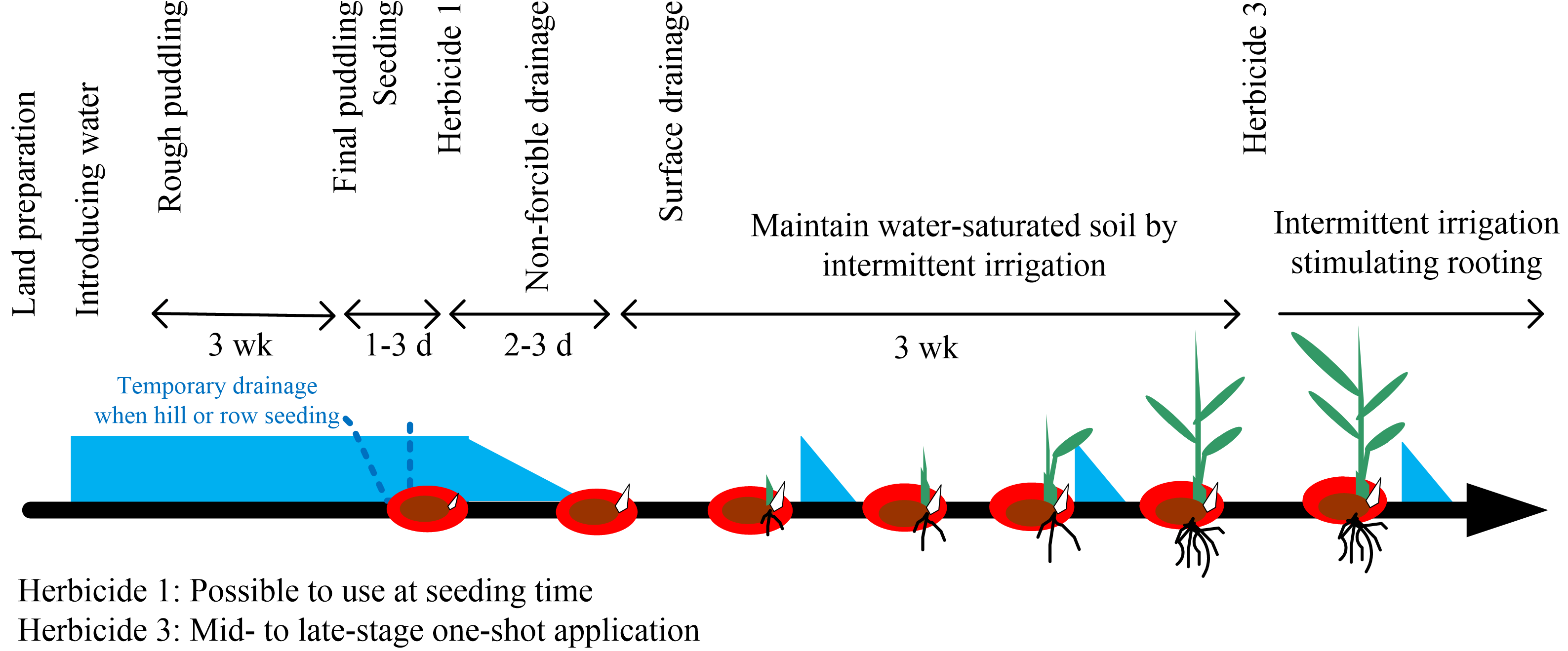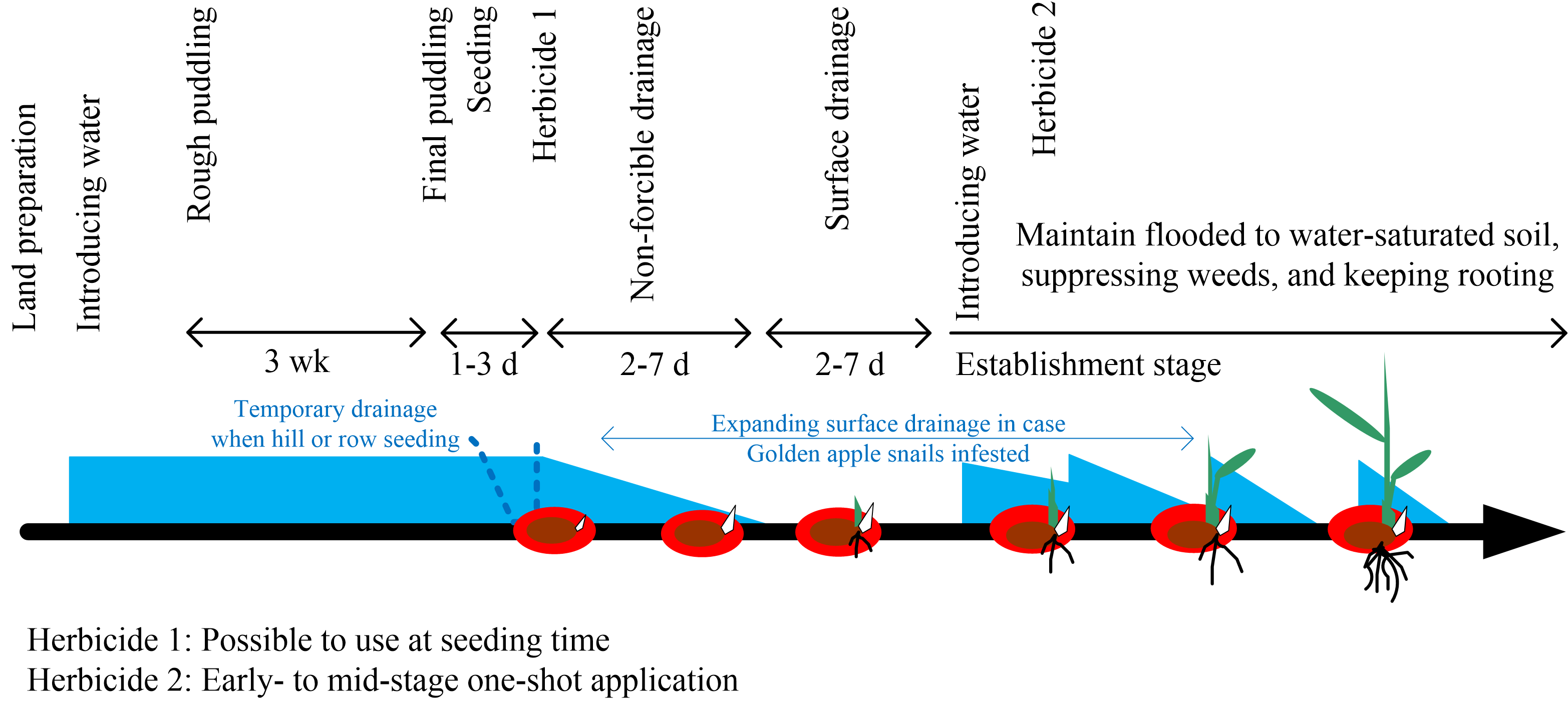 Water seeding (delayed flooding) of new iron-coated seeds. This system focuses on mid- to late-season herbicides. Drying out the water also helps control ducks, rice water weevils, and apple snails. To use a single herbicide system, omit Herbicide 1.
